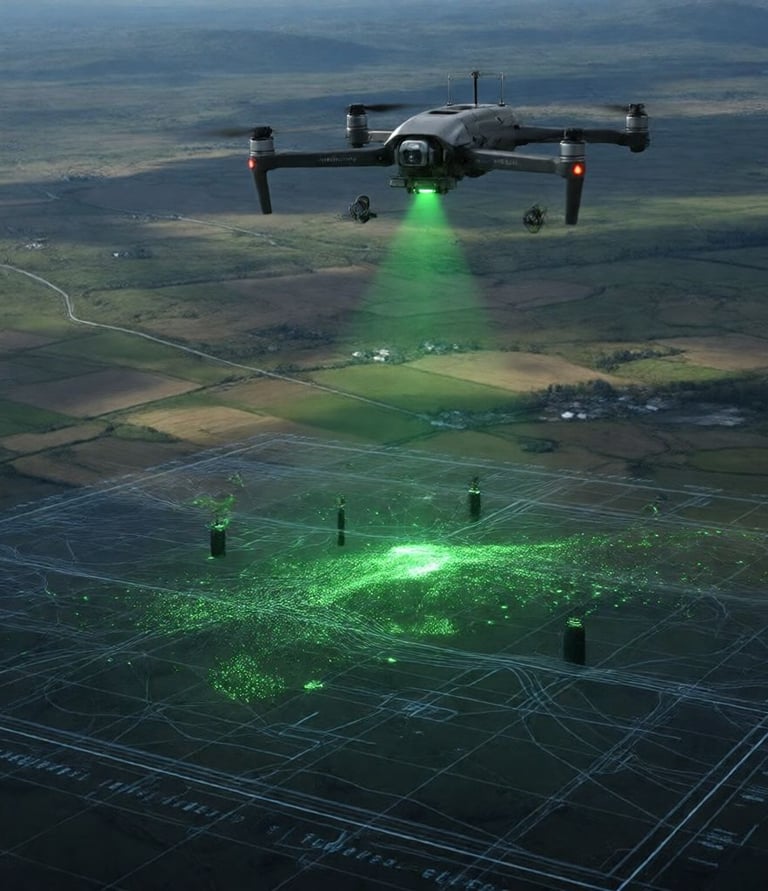 Drone-based LiDAR uses pulsed laser light to measure distances with extreme precision. When mounted on a drone, LiDAR can: