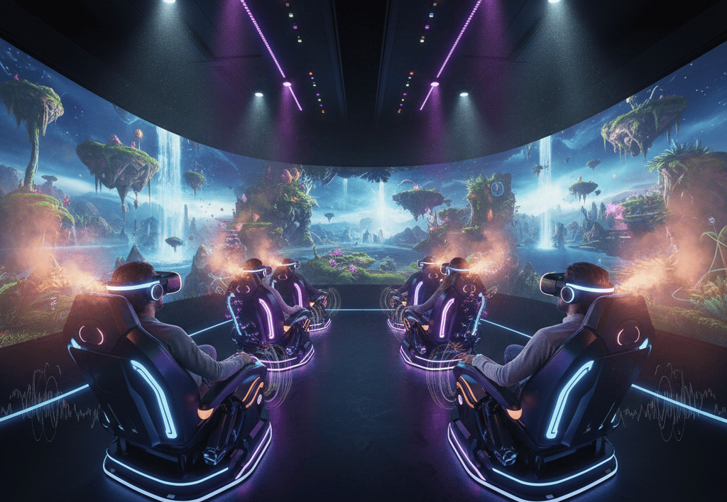 Breaking the "Flat" Barrier: Traditional 7D theaters use a flat screen. By using 360° visuals (via headsets or domes), you eliminate the edges of the screen. You can look anywhere, and the chair will still react to your perspective.