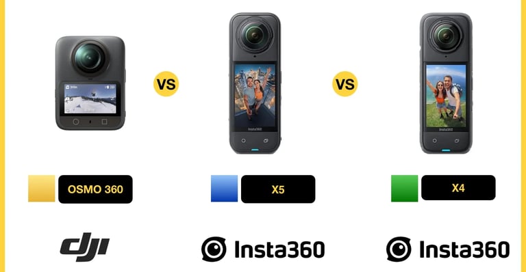 Compare Insta360 X4, DJI Osmo 360, and Insta360 X5. Find out which 360° camera delivers the best clarity, low-light performance, battery life, and value for your VR and cinematic projects.